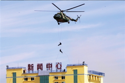 雪豹突擊隊針對奧運,開展了一系列有針對性的反恐訓(xùn)練。北京郊區(qū)某武警訓(xùn)練基地是其演兵場。