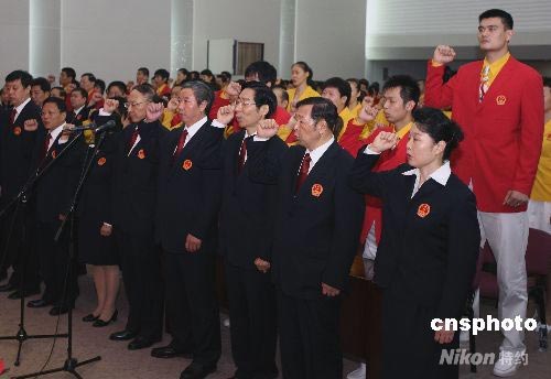 7月25日上午,參加北京奧運會的中國體育代表團正式成立,代表團團長、中國國家體育總局局長劉鵬等官員與中國的眾多體育明星,包括姚明、劉翔、朱啟南等面對國旗莊嚴宣誓。 中新社發(fā) 任晨鳴 攝