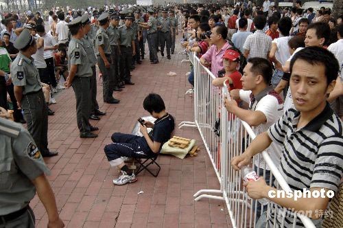 7月25日上午9時,第4階段奧運門票銷售正式開始,北京五棵松籃球體育館外排隊數(shù)日的數(shù)千球迷在安保人員的指揮下有序入場購買。 中新社發(fā) 徐曦弋 攝