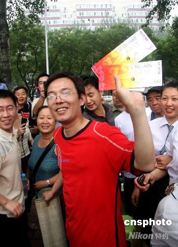7月25日,北京奧運(yùn)會(huì)籃球比賽門票開始在五棵松籃球館發(fā)售,北京的何先生排了60個(gè)小時(shí)的隊(duì),成為第一位購得比賽門票的幸運(yùn)者。 中新社發(fā) 甄雪原 攝