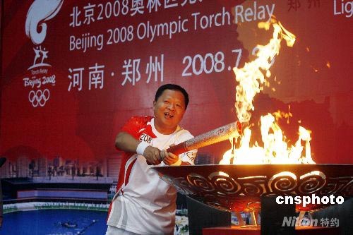 7月25日,中國工程院院士、中國信息與通信工程專家、解放軍信息工程大學校長鄔江興點燃圣火盆,奧運火炬在鄭州的傳遞正式結束。 中新社發(fā) 慎重 攝