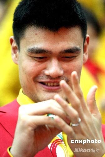 7月25日,參加北京奧運會的中國體育代表團在北京正式成立。中國男籃的“擎天柱”姚明為了報效祖國將暫時與愛妻葉莉“分居 ”,全力備戰(zhàn)。中新社發(fā) 任晨鳴 攝