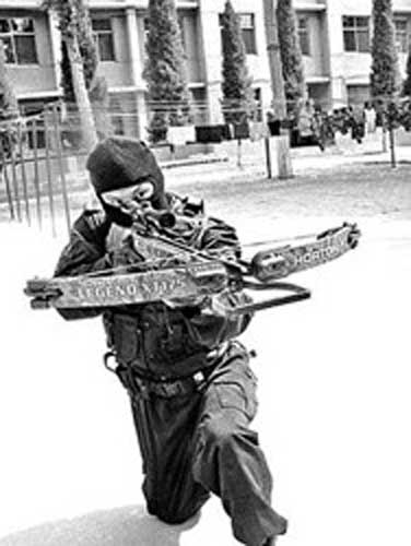 自述:我的外形很傳統(tǒng),乍一看,有些古代暗器的感覺。但我的威力卻不是其他普通弓箭所能比擬的。有了高科技的幫助,我的射程大大提高!鞍俨酱睢笔枪糯呤值慕^技。但如今,有了紅外線瞄準器的幫助,任何反恐突擊隊員在使用我時,都可以百發(fā)百中。而強力弩弓的穿透力甚至能將15厘米厚的樹木一擊即穿。