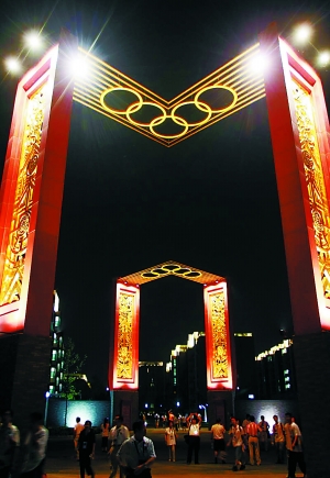 走出宿舍,透透氣,我發(fā)現(xiàn)這里還有12個(gè)居民服務(wù)中心,里面吃喝玩樂(lè)都有。當(dāng)夜幕降臨,我看到那個(gè)奧運(yùn)村生活區(qū)朱紅大門(mén)上燈火輝煌,五環(huán)標(biāo)志十分醒目。的確,我們是為了奧林匹克精神來(lái)到這里。