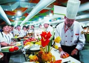 奧運村餐廳堪稱“萬人大食堂”,主餐廳位于居住區(qū)的北側,提供24小時餐飲服務。記者看到,餐廳設有四大餐區(qū):國際餐區(qū)、地中海餐區(qū)、亞洲餐區(qū)及中國餐區(qū),還包括猶太餐、清真餐、印度餐等菜品,并有明顯的菜單標牌提示,供村民選擇。名聞天下的北京烤鴨也進駐了奧運村,運動員每天都可品嘗。餐廳按照70%西餐、30%中餐比例配備菜品,并且菜單8天一個循環(huán)周期。