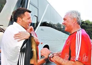剛剛從比利時刺探完軍情返回國內的杜伊前晚也已趕到長春和國奧大部隊會合。作為東道主,杜伊和另兩名塞籍助理教練托米奇、米西奇一早就在酒店的大堂等待同胞的抵達。當塞隊大巴駛抵酒店門外,杜伊三人親切地迎了上去,和塞隊的官員、教練和球員逐一握手歡迎。