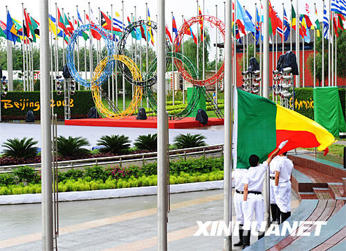 29日上午,北京微風(fēng)徐徐,氣候十分涼爽。11點(diǎn),奧運(yùn)村為貝寧代表團(tuán)舉行了升旗儀式,這也是首個(gè)舉辦這一儀式的外國(guó)代表團(tuán)。