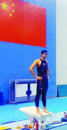 圖為中國隊員吳鵬體驗(yàn)“鯊魚皮”的神奇