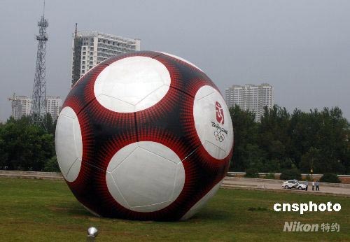 7月30日,秦皇島市區(qū)內(nèi)巨大的足球雕塑。當(dāng)日,奧運(yùn)火炬在河北省秦皇島市進(jìn)行傳遞。秦皇島是北京奧運(yùn)會足球比賽分賽場之一。 中新社發(fā) 廖攀 攝