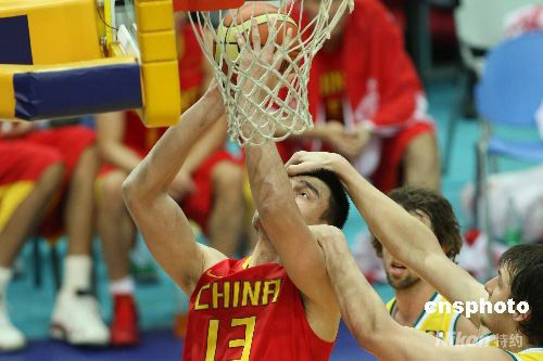 7月30日,國際籃聯(lián)2008鉆石杯男籃比賽第二輪繼續(xù)在江蘇南京進行,中國男籃狀態(tài)萎靡,以55比67不敵澳大利亞隊。姚明本場得14分,但他在進攻中卻遭對手“按頭鎖喉”。中新社發(fā) 盛佳鵬 攝