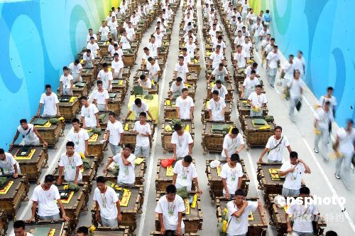第29屆夏季奧運會開幕式彩排在北京國家體育場“鳥巢”封閉進行,眾多參演人員攜帶各種道具進入體育場。 中新社發(fā) 武仲林 攝