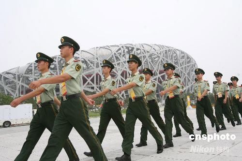 第29屆夏季奧運(yùn)會(huì)開幕式彩排在北京國(guó)家體育場(chǎng)“鳥巢”內(nèi)封閉進(jìn)行,武警、特警現(xiàn)場(chǎng)戒備,保安嚴(yán)密。 中新社發(fā) 武仲林 攝