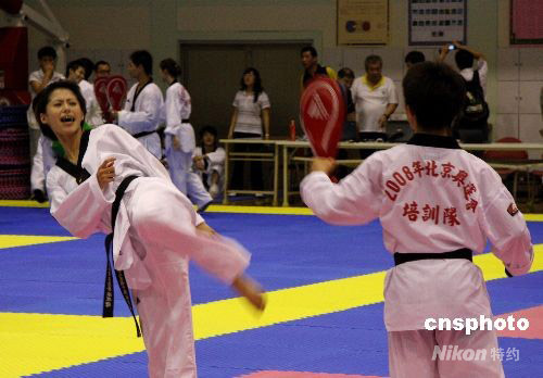 七月三十日,中華臺(tái)北隊(duì)跆拳道選手楊淑君在高雄左營(yíng)選手訓(xùn)練中心訓(xùn)練,備戰(zhàn)北京奧運(yùn)會(huì)。她與朱木炎被認(rèn)為是中華臺(tái)北隊(duì)的有力奪金選手。 中新社發(fā) 曾嘉 攝