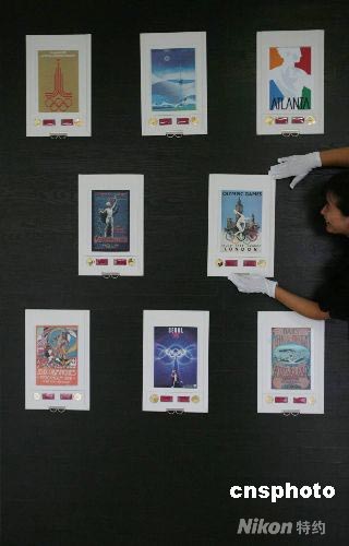 由國際奧組委授權、國際奧林匹克博物館館藏珍品《百年奧運——理解奧運會金牌海報典藏》大全套首批7月30日抵京,從即日起開始發(fā)售。該典藏首次集齊歷屆奧運會金牌,首次以絲綢印刷歷屆海報。圖為工作人員接收首批產(chǎn)品,并懸掛布置展出現(xiàn)場。 中新社發(fā) 李英 攝