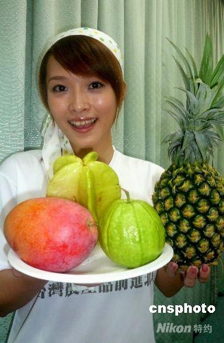 獲選奧運(yùn)推薦水果的臺灣鳳梨(菠蘿)、楊桃、芭樂(番石榴)、芒果共計(jì)10噸,正由島內(nèi)陸續(xù)運(yùn)往北京專供奧運(yùn)村。圖為記者會上,女主持人托著被形容為F4的這四種水果供記者拍照。中新社發(fā) 董會峰 攝