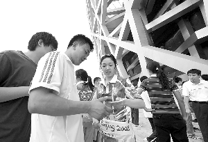 昨天下午,記者看到原定于18時開放的公共區(qū)提前迎客,17時許已有少量觀眾進場,18時左右,迎來觀眾入場高峰,奧林匹克公園東北門安檢處排起近20米的長隊。觀眾進場后,并不急于進鳥巢,而是在奧運景觀大道上游玩。