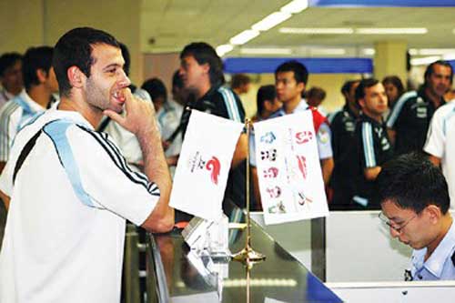 飛機比預定的時間晚到了幾分鐘,11時45分,阿根廷國奧隊的運動員走出機艙,他們談笑風生,顯得非常輕松。通過檢測體溫區(qū)域后,馬斯切拉諾第一個站到了邊檢驗證臺前。“您好!”邊檢民警用西班牙語向這位著名球員表示問候,并很快幫他辦理了入境通關手續(xù)。