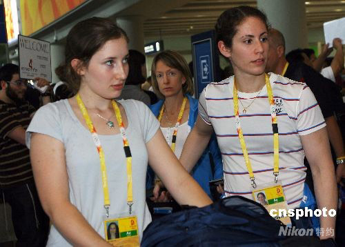 7月31日,美國擊劍隊兩名女運動員隨其它運動員一起抵達北京首都國際機場。 中新社發(fā) 劉新 攝