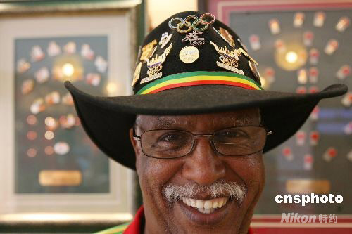 7月31日,參加過十屆奧運(yùn)會的Aberra D Aguegnehu在北京奧運(yùn)村展示他的帽子和奧運(yùn)紀(jì)念章。Aberra D Aguegnehu是國際奧委會語言志愿者,懂十五種語言,能流利說七種語言。