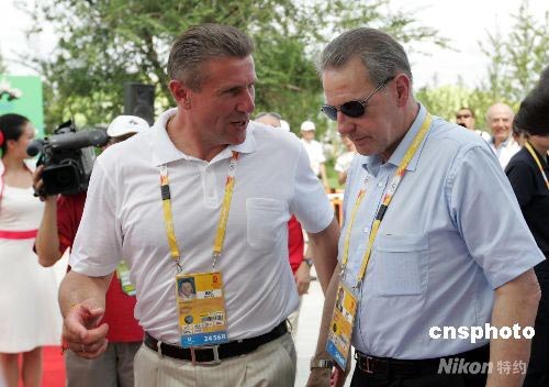 國際奧委會(huì)主席羅格與國際奧委會(huì)運(yùn)動(dòng)員委員會(huì)主席、前世界著名撐竿跳高運(yùn)動(dòng)員謝爾蓋·布勃卡(左)在一起交談。 中新社發(fā) 杜洋 攝