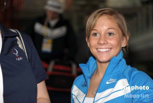8月1日下午,美國女子體操隊(duì)運(yùn)動(dòng)員一行飛抵北京,其體操領(lǐng)軍人物肖恩.約翰遜、柳金等選手將征戰(zhàn)北京奧運(yùn)會(huì)。 中新社發(fā) 陳文 攝