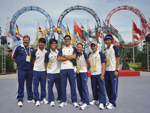 圖:香港單車隊與賽艇隊成員在奧運五環(huán)前合照(大公報攝)