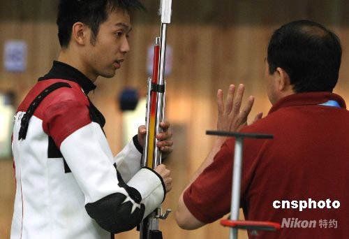 8月2日上午,雅典奧運會射擊冠軍、中國著名神槍手朱啟南在北京奧運會射擊賽場靜心訓練,3組實彈射擊,30發(fā)獲得299環(huán)的優(yōu)異成績。 中新社發(fā) 任晨鳴 攝