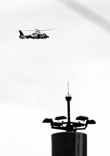 8月1日,執(zhí)行安保任務(wù)的國產(chǎn)警用直升機(jī)盤旋在北京奧運(yùn)場館上空。 喻志勇攝