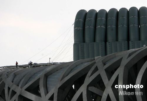 8月2日,北京奧運會開幕式第二次彩排在國家體育場“鳥巢”進(jìn)行。圖為工作人員在“鳥巢”頂部布置。 中新社發(fā) 武仲林 攝