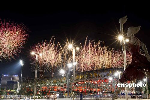 8月2日,北京奧運(yùn)會(huì)開幕式舉行第二次彩排,璀璨的焰火扮靚國家體育場“鳥巢”。 中新社發(fā) 杜洋 攝
