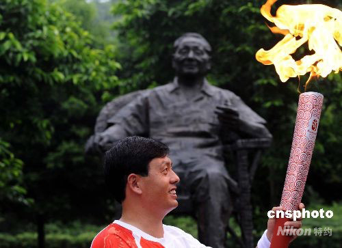 鄧小平故里牌坊村村民李良國(guó)在小平銅像前傳遞火炬。 中新社發(fā) 廖攀 攝