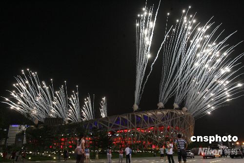 圖:奧運會開幕式彩排 “鳥巢”上空煙花綻放