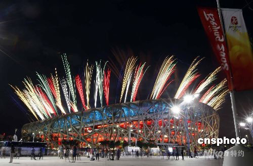 8月2日,北京奧運(yùn)會(huì)開幕式彩排,“鳥巢”放焰火。 中新社發(fā) 杜洋 攝