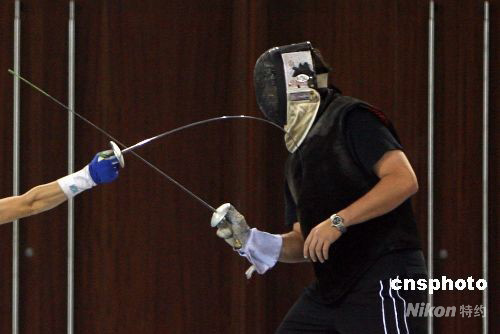 8月3日,兩名運動員在北京國際會議中心擊劍館進行賽前訓練,備戰(zhàn)即將揭幕的北京奧運。 中新社發(fā) 武仲林 攝