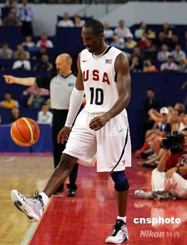 8月3日,美國男籃國際挑戰(zhàn)賽上海站比賽在旗忠網(wǎng)球中心舉行。球星云集的美國男籃最終憑借出色發(fā)揮以89比68戰(zhàn)勝俄羅斯隊。美國球星科比·布萊恩特 (Kobe Bryant)比賽間隙在觀眾面前大秀“腳功”。中新社發(fā) 湯彥俊 攝