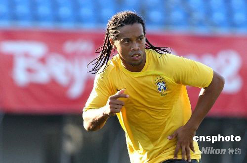 圖:羅納爾迪尼奧認真進行奧運賽前訓(xùn)練