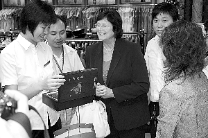昨日,市場工作人員贈送羅格夫人(中)一套《孫子兵法》竹簡。