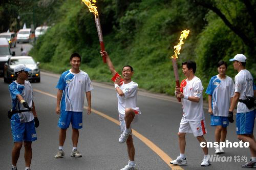 8月4日,奧運(yùn)火炬在樂山峨眉山下傳遞,火炬手做起武俠造型傳遞火炬。中新社發(fā) 廖攀 攝
