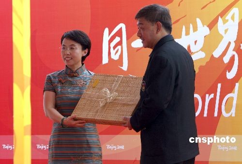 圖為菲律賓奧運(yùn)代表團(tuán)團(tuán)長(zhǎng)Julian Camacho和北京奧運(yùn)村值班村長(zhǎng)程紅(左)交換禮品。