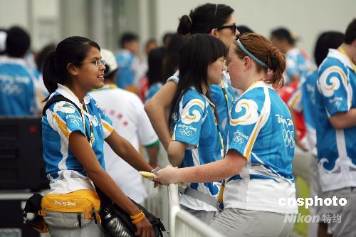 8月4日,幾名外國志愿者在北京奧運(yùn)會自行車賽場內(nèi)。從昨日起,200多名“百里挑一”的外籍志愿者經(jīng)過最后的培訓(xùn)后,開始在奧體中心場館群、奧運(yùn)村、主新聞中心等地參加志愿服務(wù),成為北京奧運(yùn)會數(shù)十萬名賽場志愿者中一道亮麗的風(fēng)景線。 中新社發(fā) 武仲林 攝