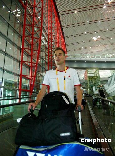 8月3日,丹麥著名羽毛球名將皮特·蓋德飛抵北京首都機(jī)場,備戰(zhàn)北京奧運(yùn)。 中新社發(fā) 富田 攝