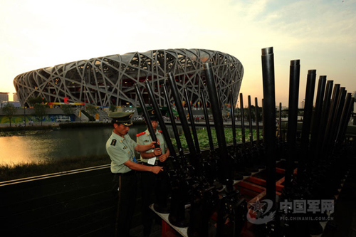 根據(jù)北京奧運(yùn)會(huì)開(kāi)幕式焰火施放方案,8月8日開(kāi)幕式當(dāng)晚,從永定門(mén)經(jīng)過(guò)天安門(mén)廣場(chǎng)到國(guó)家體育場(chǎng)“鳥(niǎo)巢”的15公里中軸線(xiàn)上,共設(shè)立35個(gè)特效焰火施放陣地。中國(guó)將首次采用新型車(chē)載式禮花炮發(fā)射禮花,開(kāi)奧運(yùn)禮花炮車(chē)載發(fā)射先河。圖為負(fù)責(zé)奧運(yùn)開(kāi)幕式禮炮發(fā)射的武警官兵預(yù)演前檢驗(yàn)禮炮狀態(tài)。馮凱旋 攝
