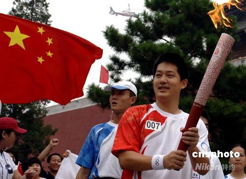 8月6日上午,奧運火炬北京站從午門開始傳遞。圖為圍棋世界冠軍常昊擔(dān)任第7棒火炬手傳遞奧運火炬。中新社發(fā) 王東明 攝