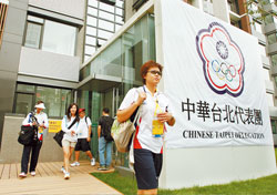 中華臺(tái)北隊(duì)的人數(shù)比較少,雖然住了1至4樓,但每個(gè)樓層只有兩個(gè)居住單位,不像對面的大陸隊(duì)占了半幢大樓,且每個(gè)窗口都掛上五星旗。中華臺(tái)北代表團(tuán)也在一樓入口處外墻掛上一幅長、寬各數(shù)公尺的特大號(hào)中華臺(tái)北奧委會(huì)會(huì)旗,顯得非常醒目;經(jīng)過的人大都會(huì)駐足觀看,甚至拍照留念。