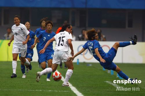 8月6日,北京奧運(yùn)會秦皇島足球分賽場首場女足預(yù)賽,日本與新西蘭的比賽2:2戰(zhàn)平。圖為新西蘭隊Emma KETE(白衣)與日本隊爭球。 中新社發(fā) 劉新 攝