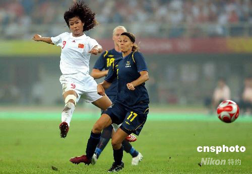 8月6日,北京奧運(yùn)會(huì)女足小組賽首輪比賽全面打響,中國(guó)女足在天津奧林匹克球場(chǎng)迎戰(zhàn)瑞典隊(duì)。下半場(chǎng)第73分鐘,中國(guó)女足9號(hào)韓端大力施射破門,打入致勝一球。 中新社發(fā) 陳文 攝