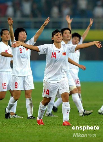 8月6日,北京奧運會女足小組賽首輪比賽全面打響,中國女足19時45分在天津奧林匹克球場迎戰(zhàn)瑞典隊,最終經(jīng)過90分鐘鏖戰(zhàn),中國女足憑借徐媛和韓端的進球,以2:1擊敗對手。賽后“鏗鏘玫瑰”們歡慶勝利。中新社發(fā) 陳文 攝