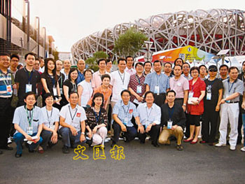 以香港文匯報(bào)社長(zhǎng)張國(guó)良為團(tuán)長(zhǎng)的香港新聞界訪(fǎng)京團(tuán)抵京率先察看奧運(yùn)之旅。圖為訪(fǎng)京團(tuán)成員在鳥(niǎo)巢前合照。(圖片來(lái)源:文匯報(bào))