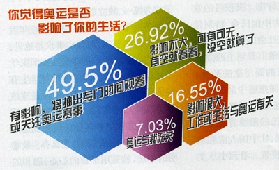“你覺得奧運是否影響了你的生活?”問卷調查結果顯示,66.05%的受調查者認為有影響或影響較大。其中表示“有影響,將抽出專門時間觀看或關注奧運賽事”的占受調查者49.5%(2228票),表示“影響很大,工作或生活與奧運有關”的占受調查者16.55%(745票)。