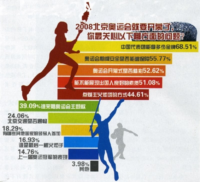 本次問卷調查結果顯示,群眾最擔心的問題,排在前三位的是:“奧運文明風一吹而過”(2668票,占總59.29%)、“奧運期間一些好的政策難以持續(xù)”(2081票,占總46.25%)、“國際社會對北京奧運會的評價不高”(1654票,占總36.76%)。而對“奧運之后經濟發(fā)展速度放緩”、“辦奧運可能入不敷出”、“北京的房價將大幅下跌”等問題,均占受調查者的35%以下。